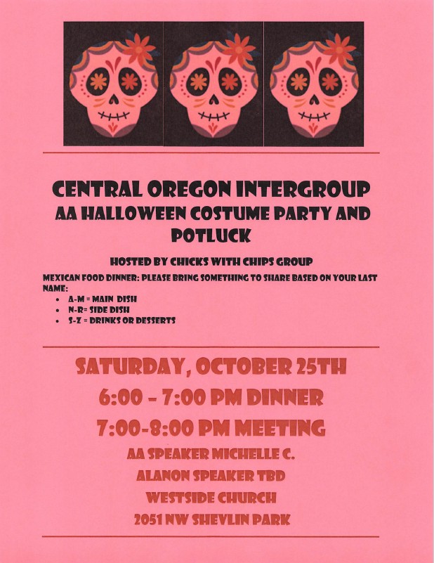 CENTRAL OREGON INTERGROUP AA HALLOWEEN COSTUME PARTY AND POTLUCK by COIGAA Admin Please leave this field empty Stay informed about your AA community with the latest Central Oregon Intergroup announcements sent directly to your inbox. We promise we’ll never spam! Thanks for signing up. Be sure to check your inbox or spam folder to confirm your subscription.