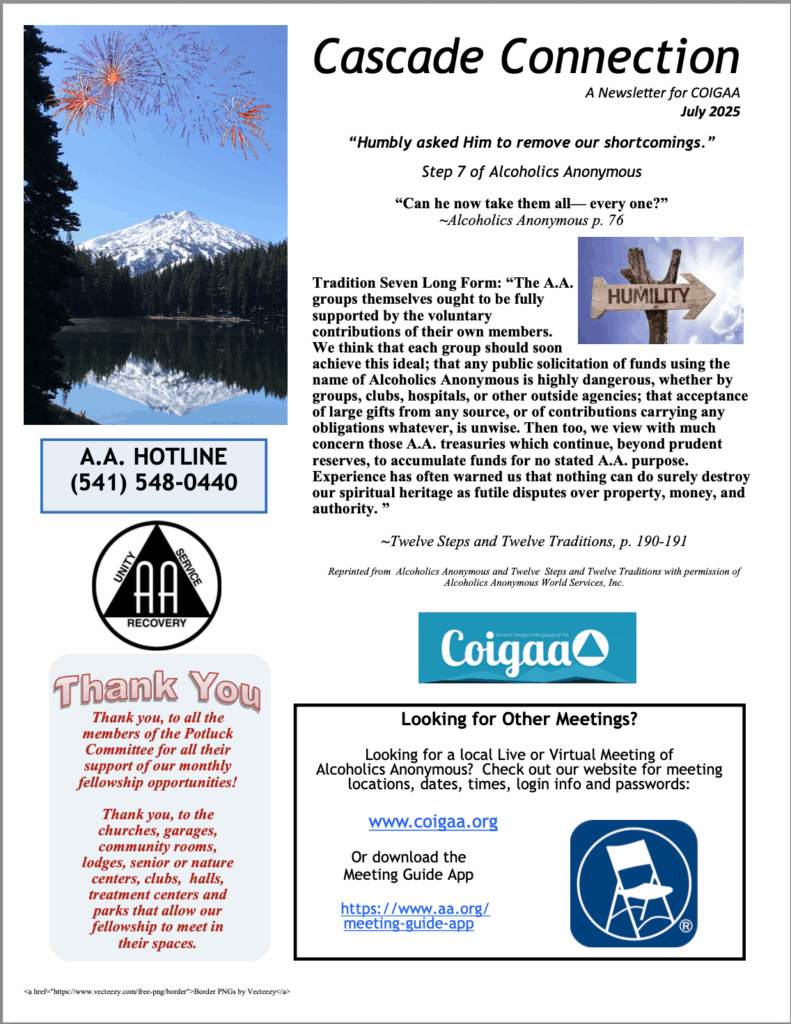 July 2025 COIG Newsletter Is HERE! by COIGAA Admin Download Newsletter Please leave this field empty Stay informed about your AA community with the latest Central Oregon Intergroup announcements sent directly to your inbox. We promise we’ll never spam! Thanks for signing up. Be sure to check your inbox or spam folder to confirm your subscription.