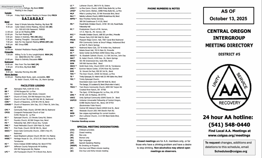 October 2025 Printable Meeting List Now Available. by COIGAA Admin Download Meeting List Please leave this field empty Stay informed about your AA community with the latest Central Oregon Intergroup announcements sent directly to your inbox. We promise we’ll never spam! Thanks for signing up. Be sure to check your inbox or spam folder to confirm your subscription.